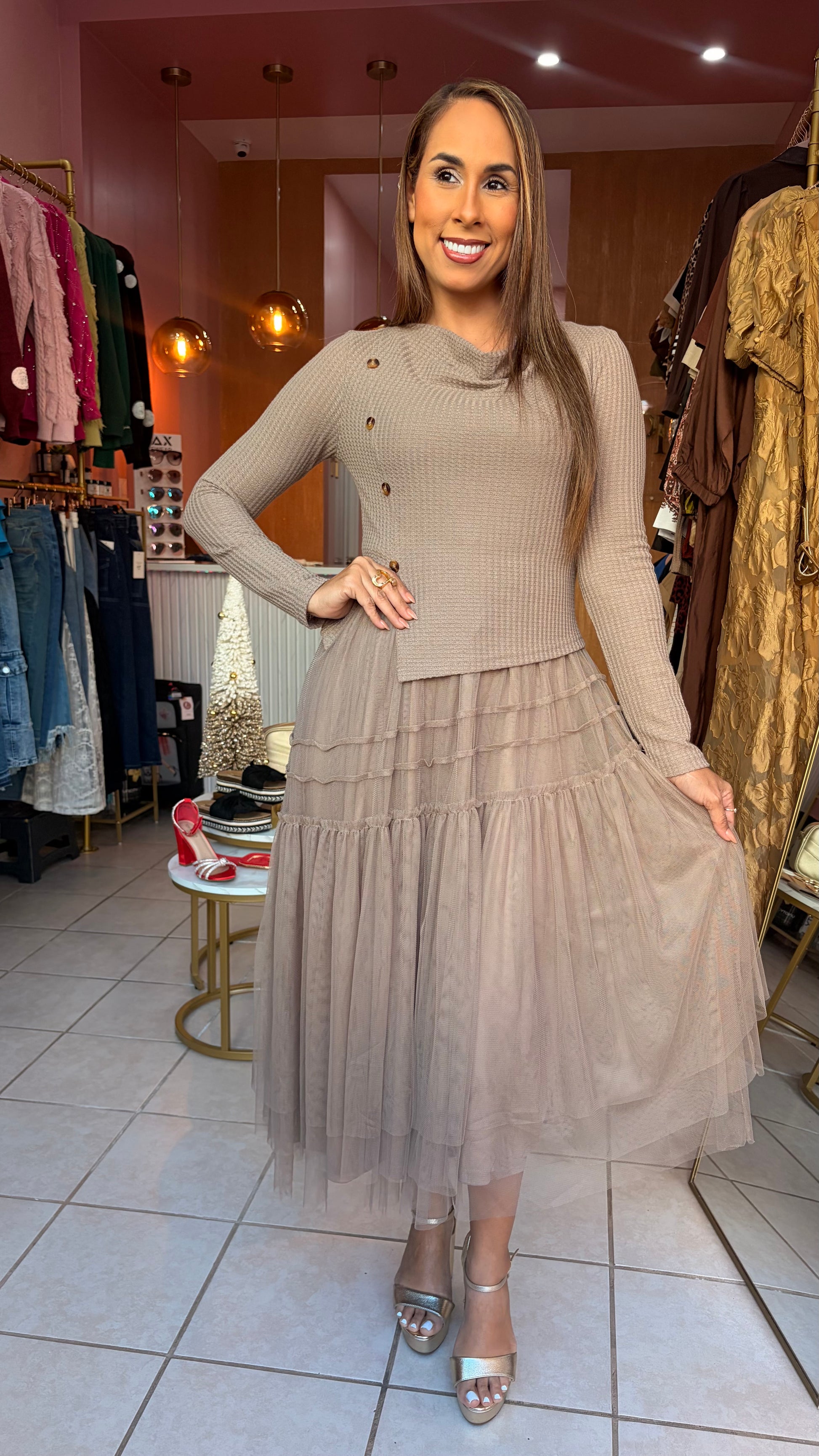 Hermoso vestido de tulle en su parte inferior.